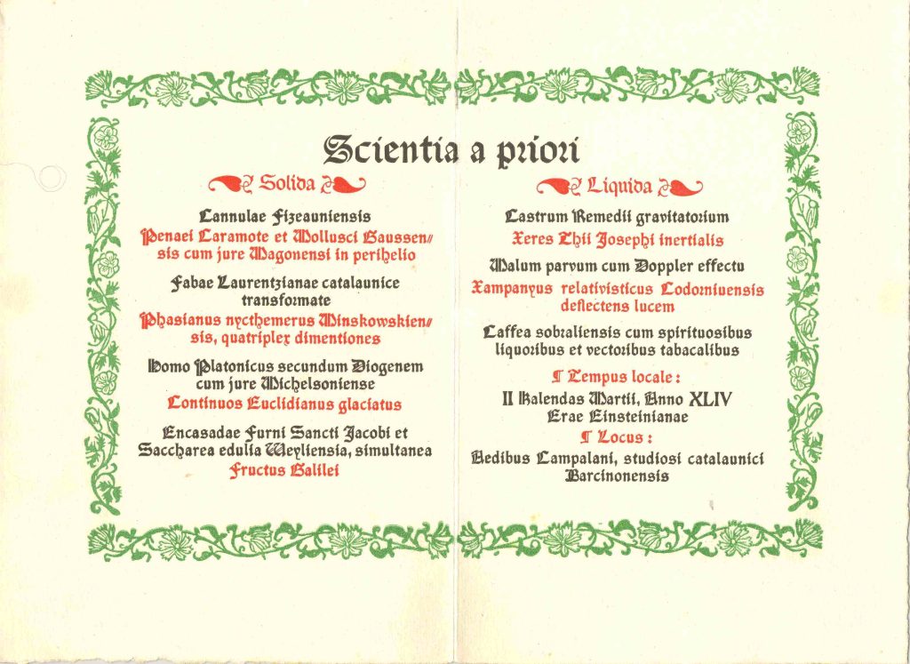 Rafael Campalans va organitzar a casa seva un sopar íntim en honor a Einstein la penúltima nit on va destacar el menú en “llatí relativista” que li van preparar al científic alemany, imprès en lletres gòtiques i en què els plats es van batejar amb conceptes referents a la teoria de la relativitat i a rellevants físics. El sopar, cuinat per la mare del mateix Campalans, va ser abundant. Durant la vetllada, van actuar el guitarrista Regino Sáinz de la Maza, el trio Barcelona i la soprano Andreua Fornells.