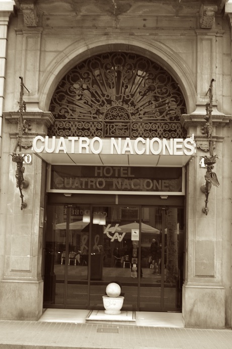 Una de les versions publicades sobre l’arribada d’Einstein a Barcelona assegura que el científic es va allotjar en una modesta pensió, “Las Cuatro Naciones”, fins que a través del propietari de l’establiment va poder contactar amb els organitzadors de la visita que el van traslladar a l’Hotel Colón, on li havien reservat una habitació de categoria.
